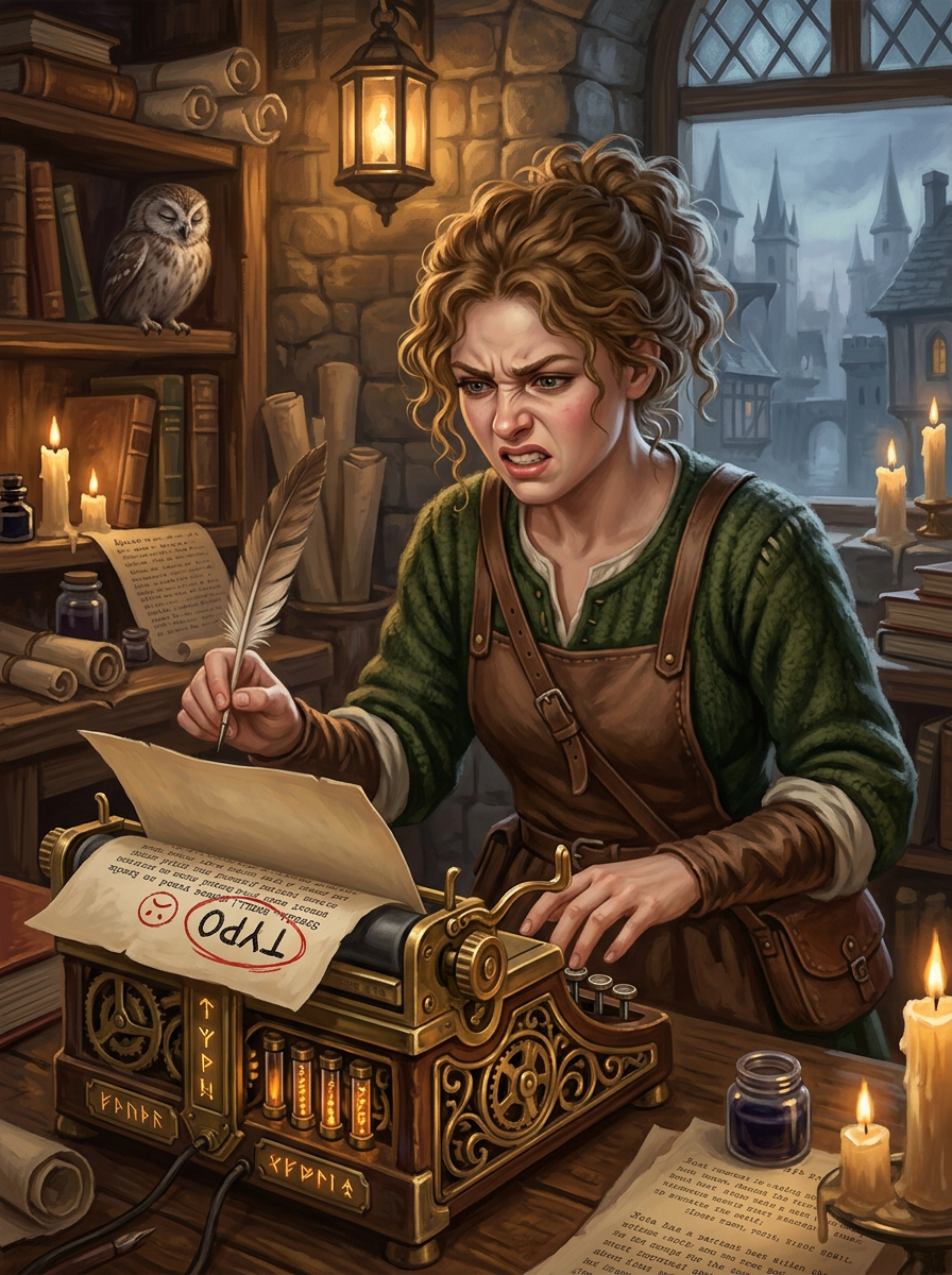 Woman in medieval style clothes frustrated using a magical typewriter with glowing runes